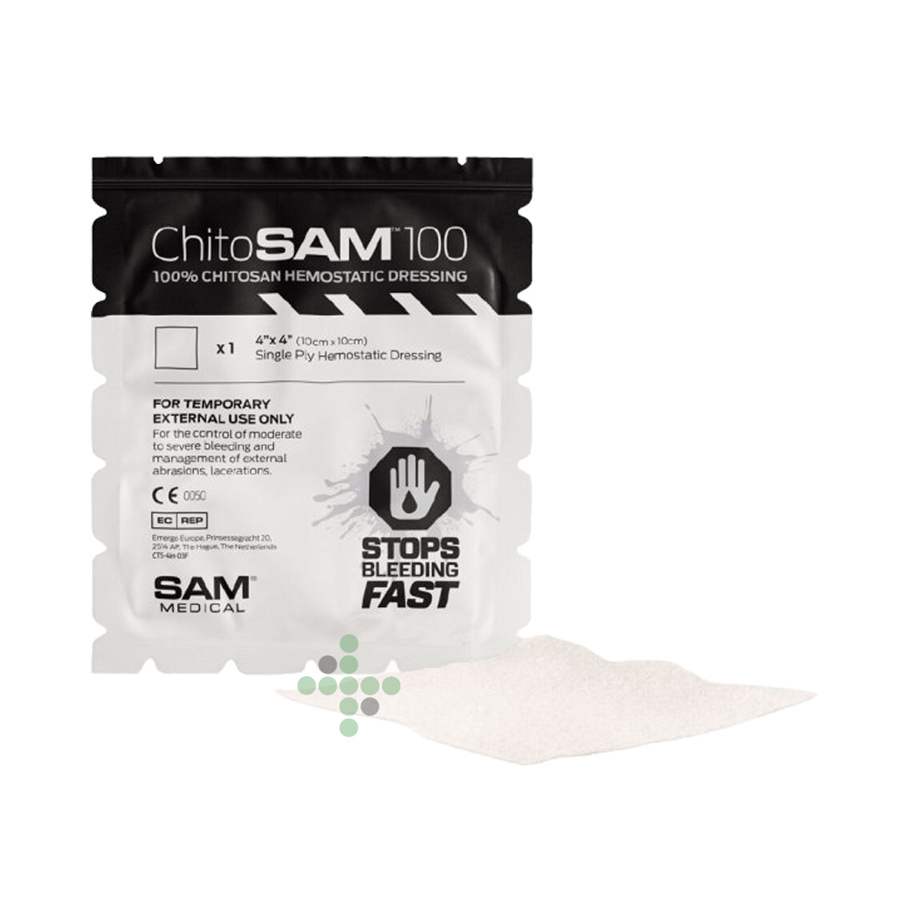 ChitoSAM 100, 4 „x 4“ je vysoce účinný hemostatický , netkaný chitosanový obvaz vyrobený přímo z chitosanu získaného ze skořápek korýšů nebo sněžných krabů. Je určen k rychlému zastavení krvácení z tržných ran, drobných poranění a odřenin a díky snadnému použití je mimořádně účinný. Působí nezávisle na normálních procesech srážení krve v těle.