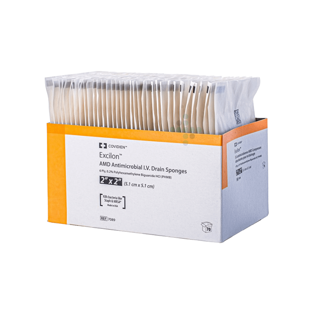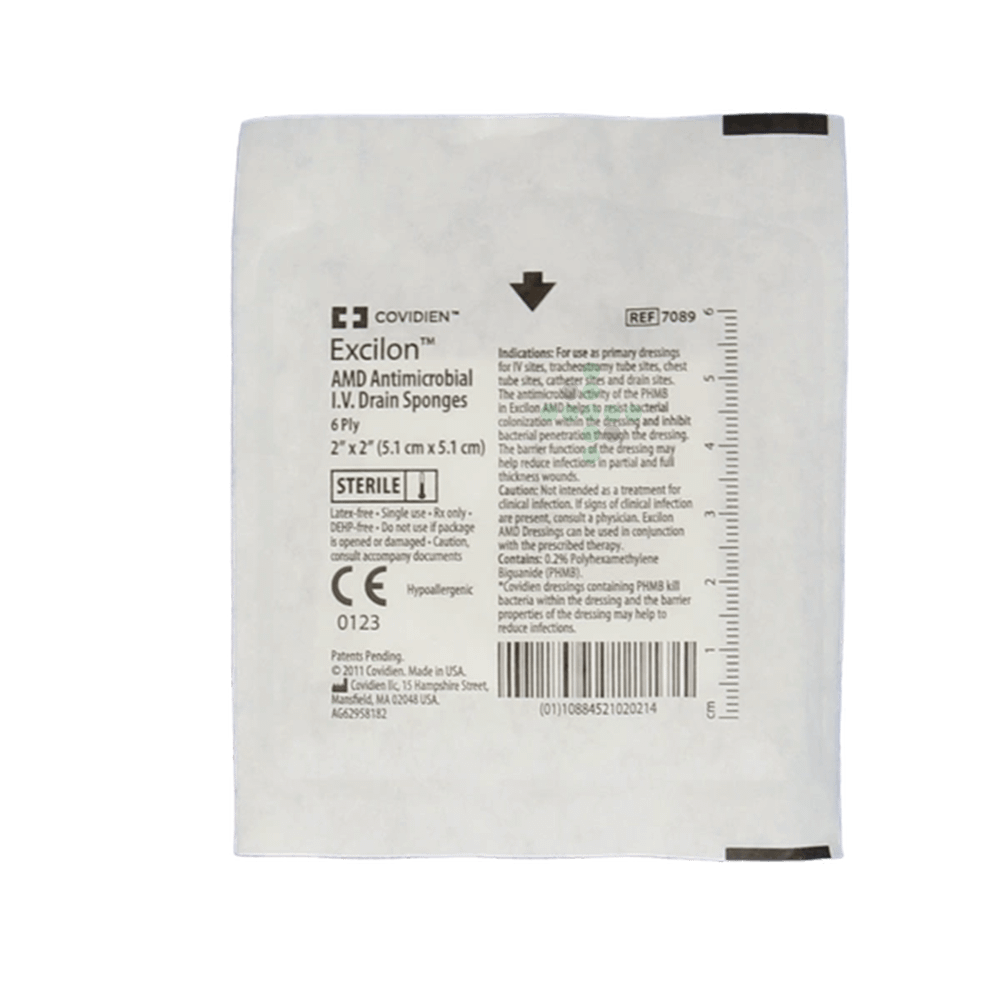 Excilon 5×5 cm - antimikrobiální obvaz. Absorpční netkaný antimikrobiální gázový obvaz s nízkou adhezí impregnovaný 0,2 % PHMB. Obvaz k překrytí v místě tracheostomické rourky.