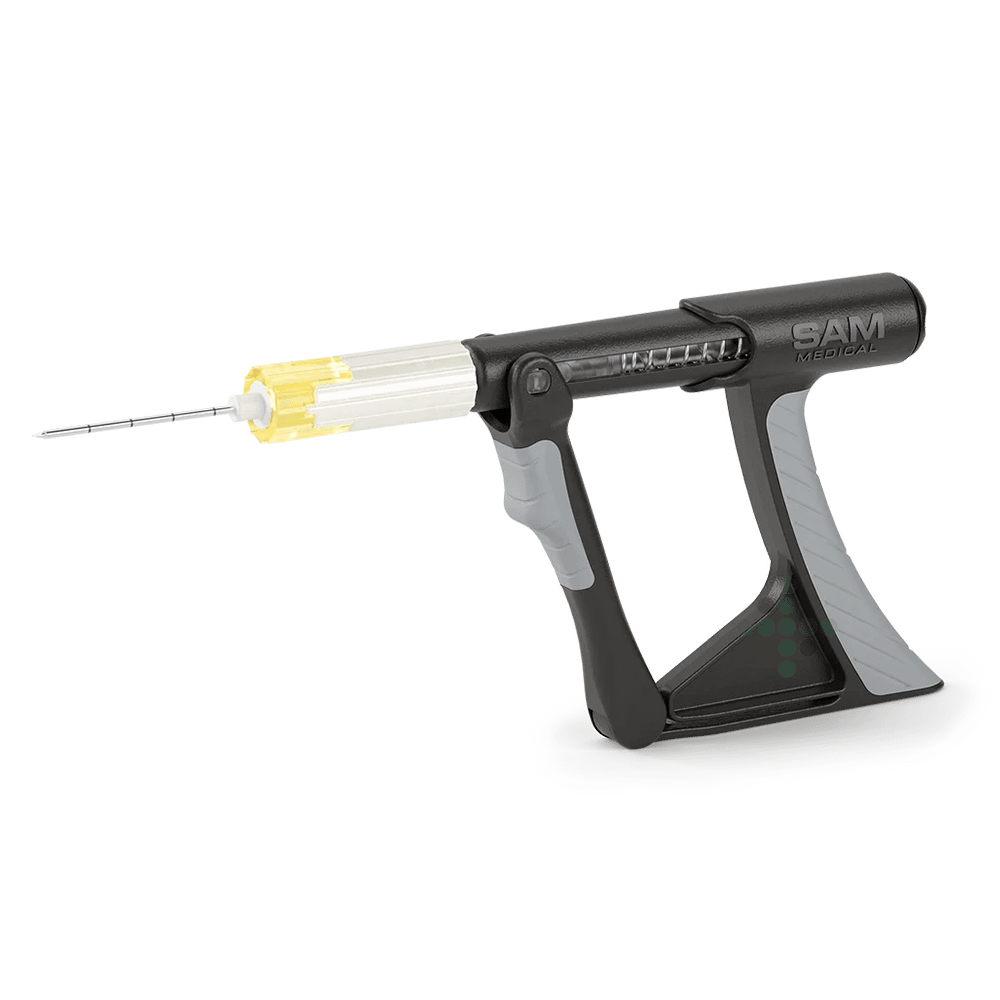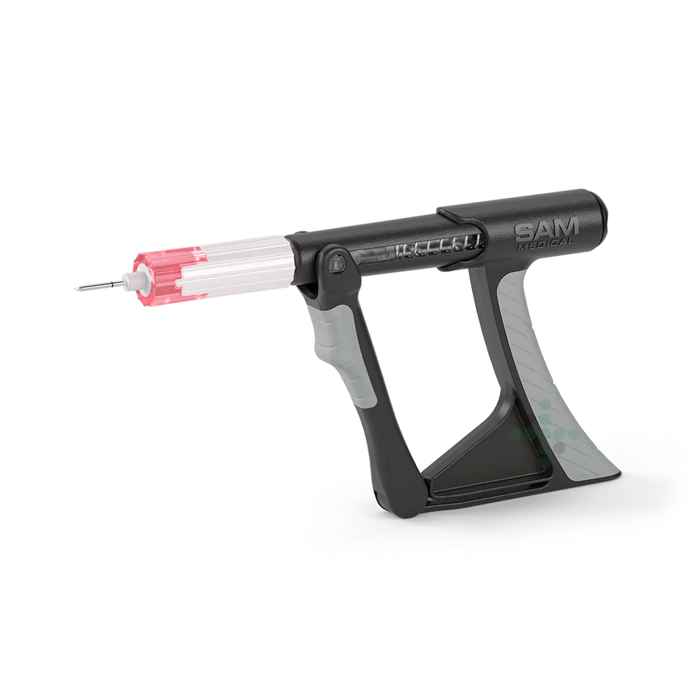 SAM-IO intraoseální vrták, je manuálně ovládaný systém pro intraoseální přístup. Opakované plné stlačení spouštěcí sestavy způsobí rotaci jehly, což v kombinaci s jemným tlakem směrem dolů vede ke kontrolovanému umístění IO.