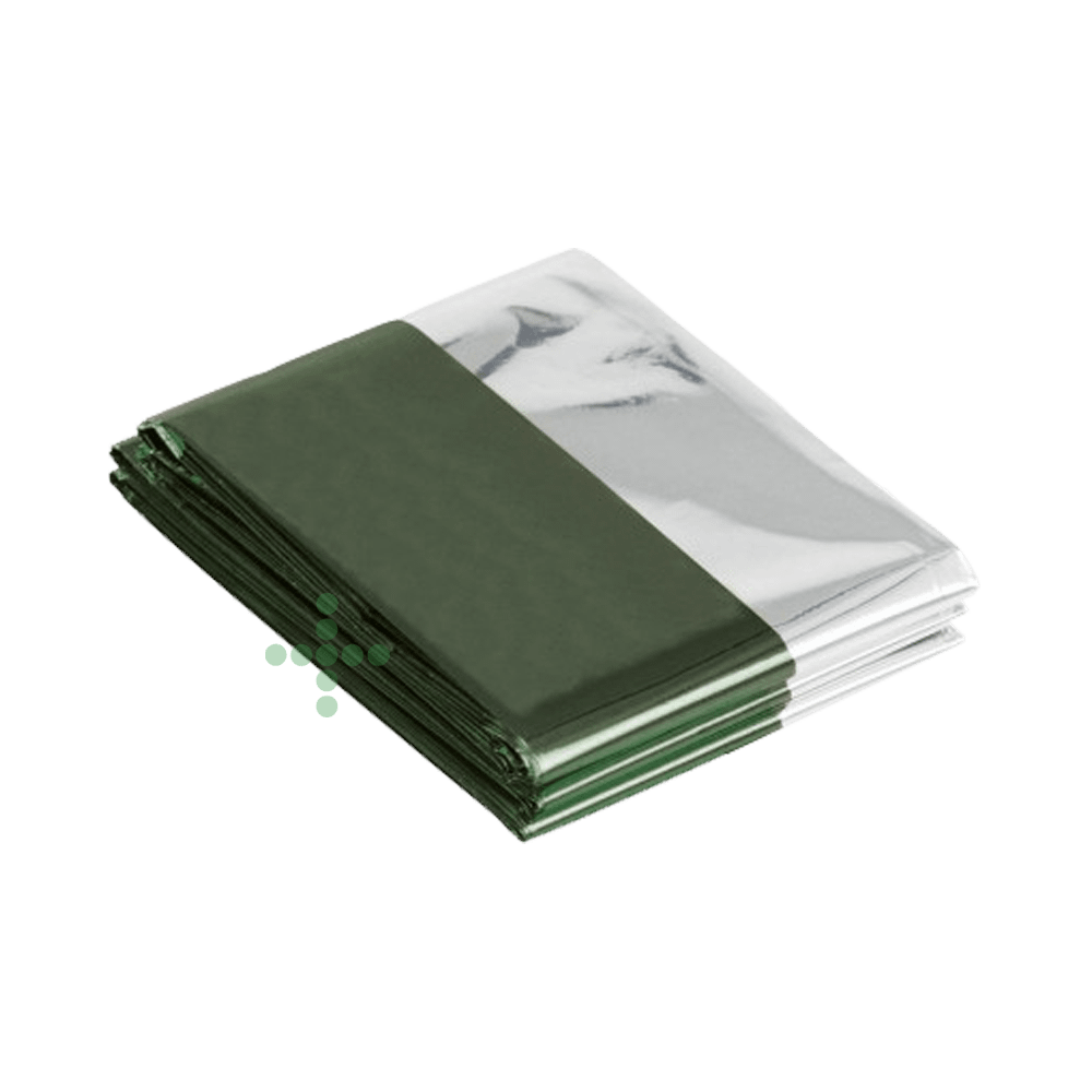 Vysoce kvalitní záchranářská plachta s hliníkovým povrchem, která chrání zraněné osoby poskytující první pomoc před podchlazením, horkem, vlhkostí nebo větrem.