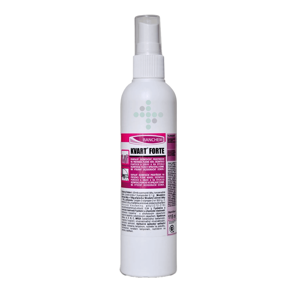 KVART FORTE 150 ml - dezinfekční sprej na obuv pro prevenci plísní nohou, dezinfekci punčoch a obuvi. Má vynikající deodorační účinek. Velmi dobrá kožní snášenlivost.