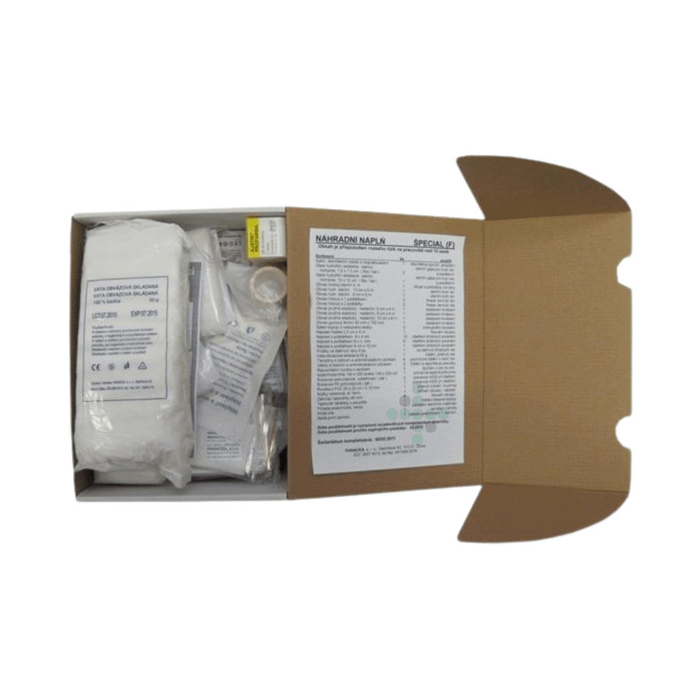 Náplň do lékárničky SPECIAL (F) je vhodná pro pracoviště s vyšším rizikem úrazu více než 15 osob. Jedná se zejména o místa se zvýšeným rizikem pádů, otevřených poranění, opaření, omrzlin, popálenin, úrazů elektrickým proudem.