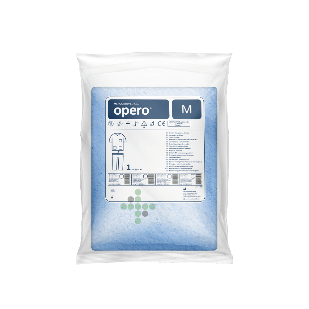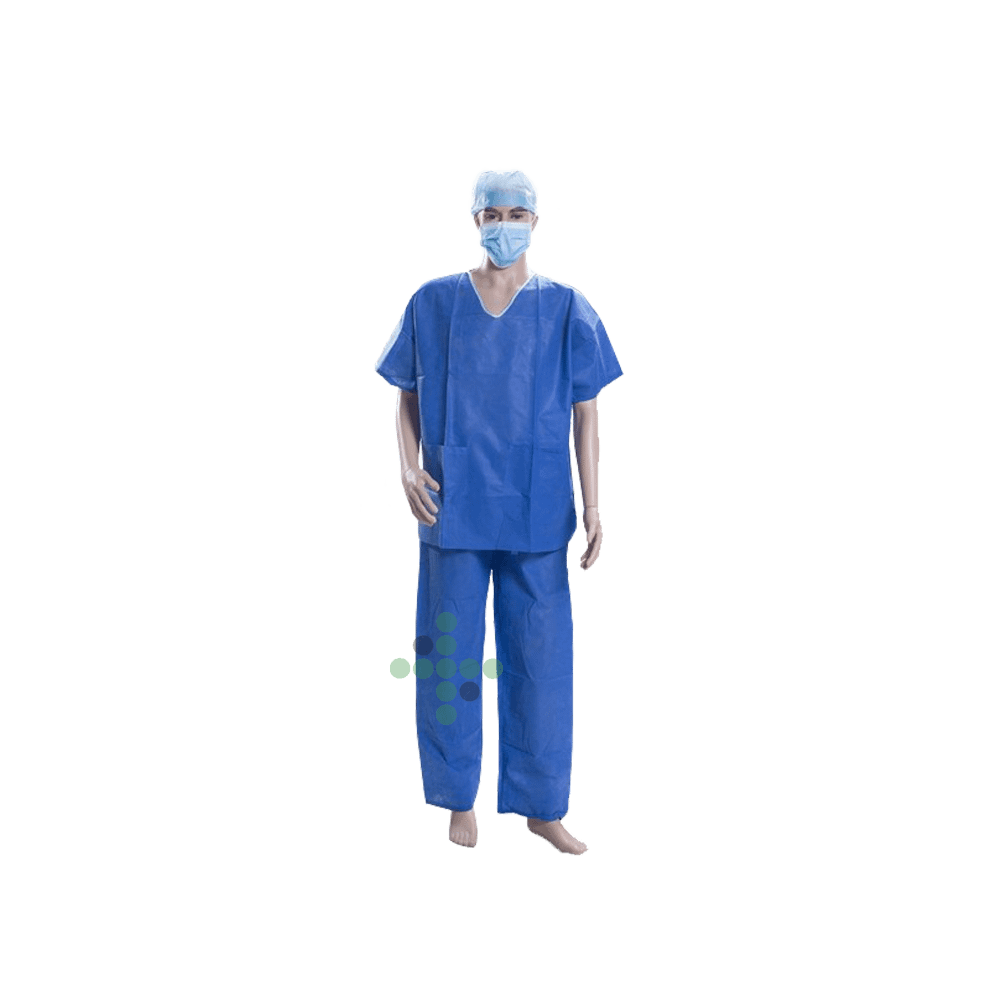 Jednorázový zdravotnický oděv z netkané textilie sestávající z kalhot a tuniky s krátkým rukávem.