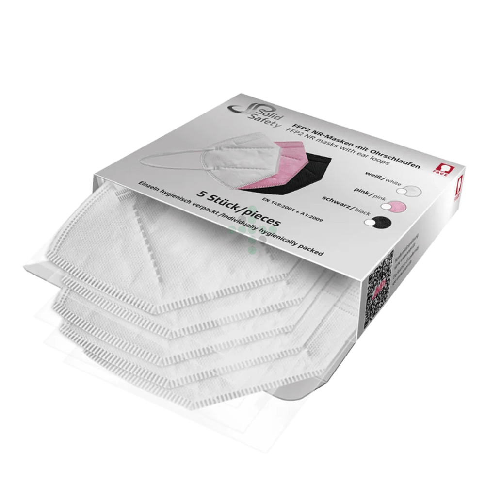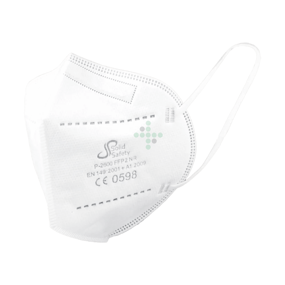 Respirátor SolidSafety FFP2, bez ventilu - bílý. S pružnými pásky na zapínání. Výrobek proto splňuje požadavky evropské normy EN 149.