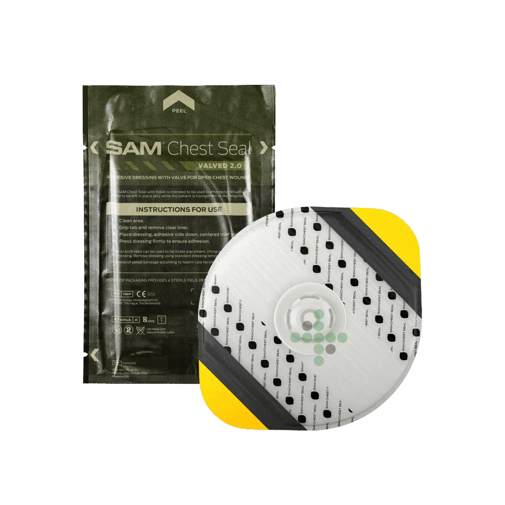 Hrudní ventil SAM® Chest Seal Valved 2.0 s TRUFLOW™ má silné lepidlo a flexibilní konstrukci, která umožňuje přizpůsobení ráně. Jednosměrný ventil zajišťuje proudění vzduchu z hrudní dutiny s nízkým odporem.