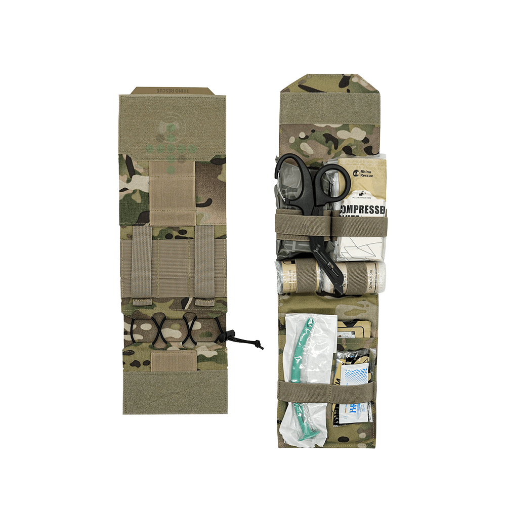 Rhino Rescue Quick Pulling IFAK je kompletní úrazová lékárnička v kompaktním pouzdře z materiálu Nylon 500D se systémem MOLLE, určená k připevnění na batoh, taktickou vestu nebo opasek. Stačí jedno zatáhnutí (jednou) rukou a vnitřní panel se zdravotnickým vybavením se okamžitě uvolní. Brašna poskytuje okamžitý přístup v kritických situacích.