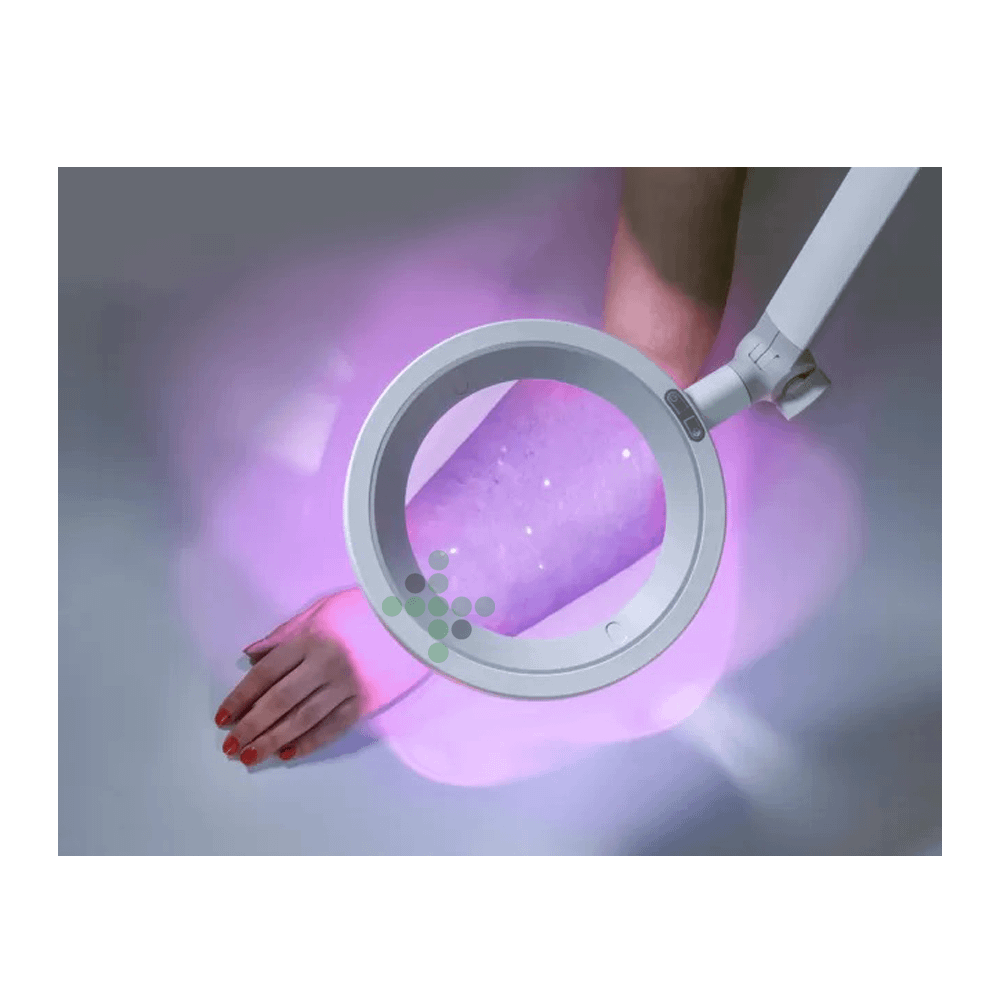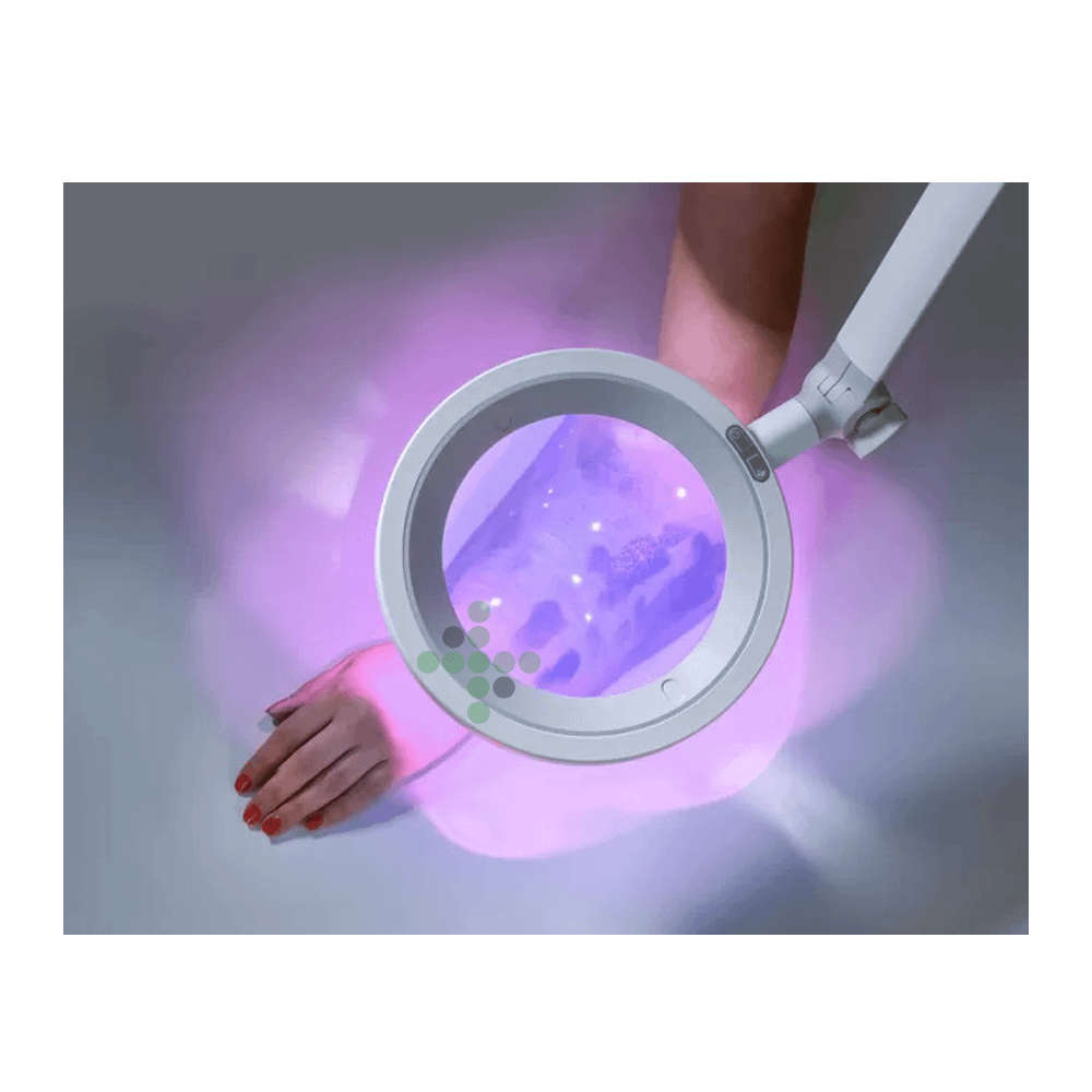 - Volitelně: režim osvětlení UV-A (dřevěné světlo) pro vyšetření fluorescenčních lézí a pigmentových změn