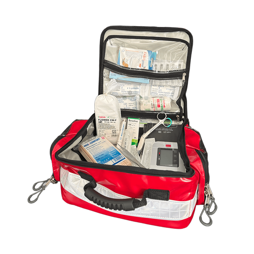 Zdravotnická brašna první pomoci HT13-ABL1-R s vybavením pro návštěvní službu u pacienta. Sáček se zdravotnickým materiálem - náplň DIN 13164.