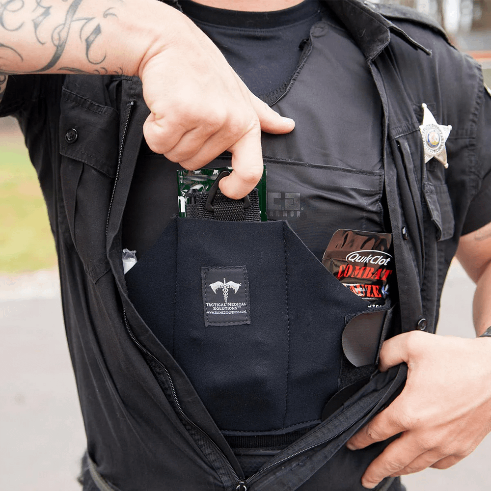 Obsahuje škrtidlo SOF®, hrudní ventil, hemostatický prostředek a tlakový obvaz Esmarch, který v případě nouze zajistí okamžitý přístup k životně důležitým zdravotnickým potřebám. Je kompatibilní s jakýmkoli nosičem balistické ochrany a lze jej přizpůsobit.